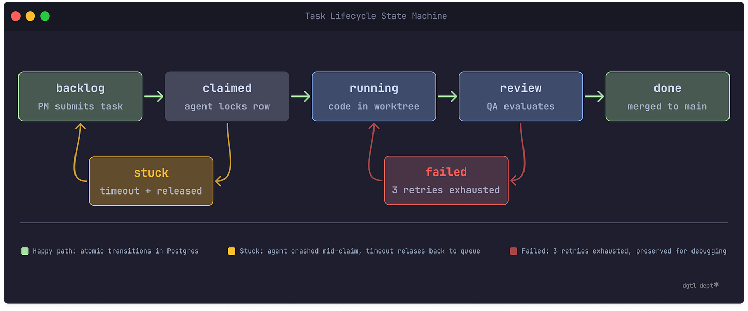The fix: SELECT FOR UPDATE SKIP LOCKED. Agents claim tasks atomically at the database level — if another agent already has it, the query returns nothing instead of blocking. And stuck tasks get a timeout: if a task stays claimed for longer than its trust tier’s max turns would allow (more on that in a moment), the system releases it back to the queue.