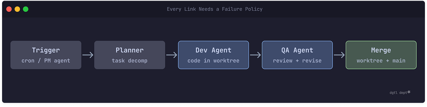 In a single agent, the answer is obvious: crash and tell me about it. In an orchestrated chain, it depends. The dev agent can work on existing tasks even if no new ones get planned. Stale tasks are better than idle agents, but a corrupted task spec is worse than nothing — the dev agent will write code to the wrong spec and the QA agent won’t catch it.