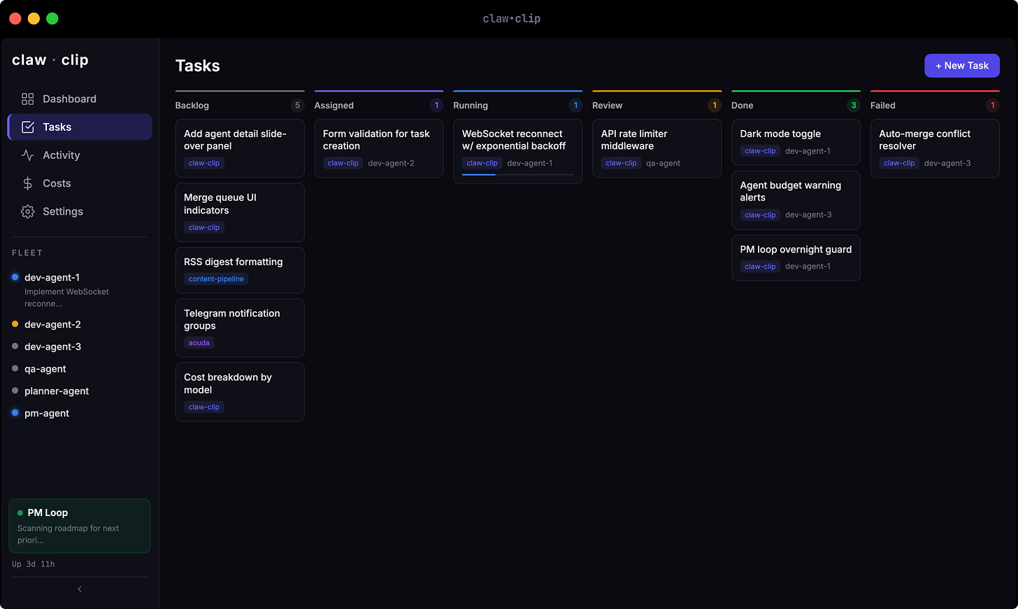 The agent loop picks up backlog tasks, claims them, executes, and updates the status. Simple enough.