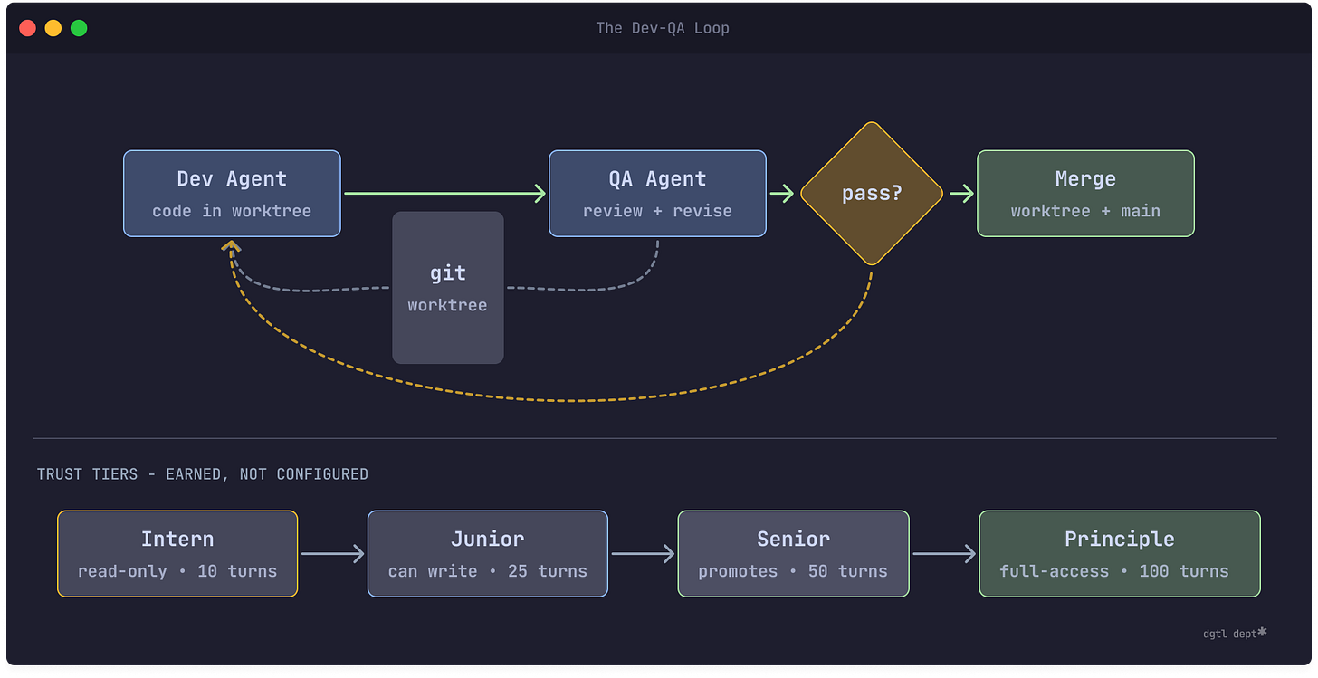 They earn promotion to junior, senior, and principal through consecutive successful completions — not set configuration. Three consecutive failures trigger a demotion. Trust isn’t a setting, it’s not unconditional. The agents have to earn it and prove they can keep it.