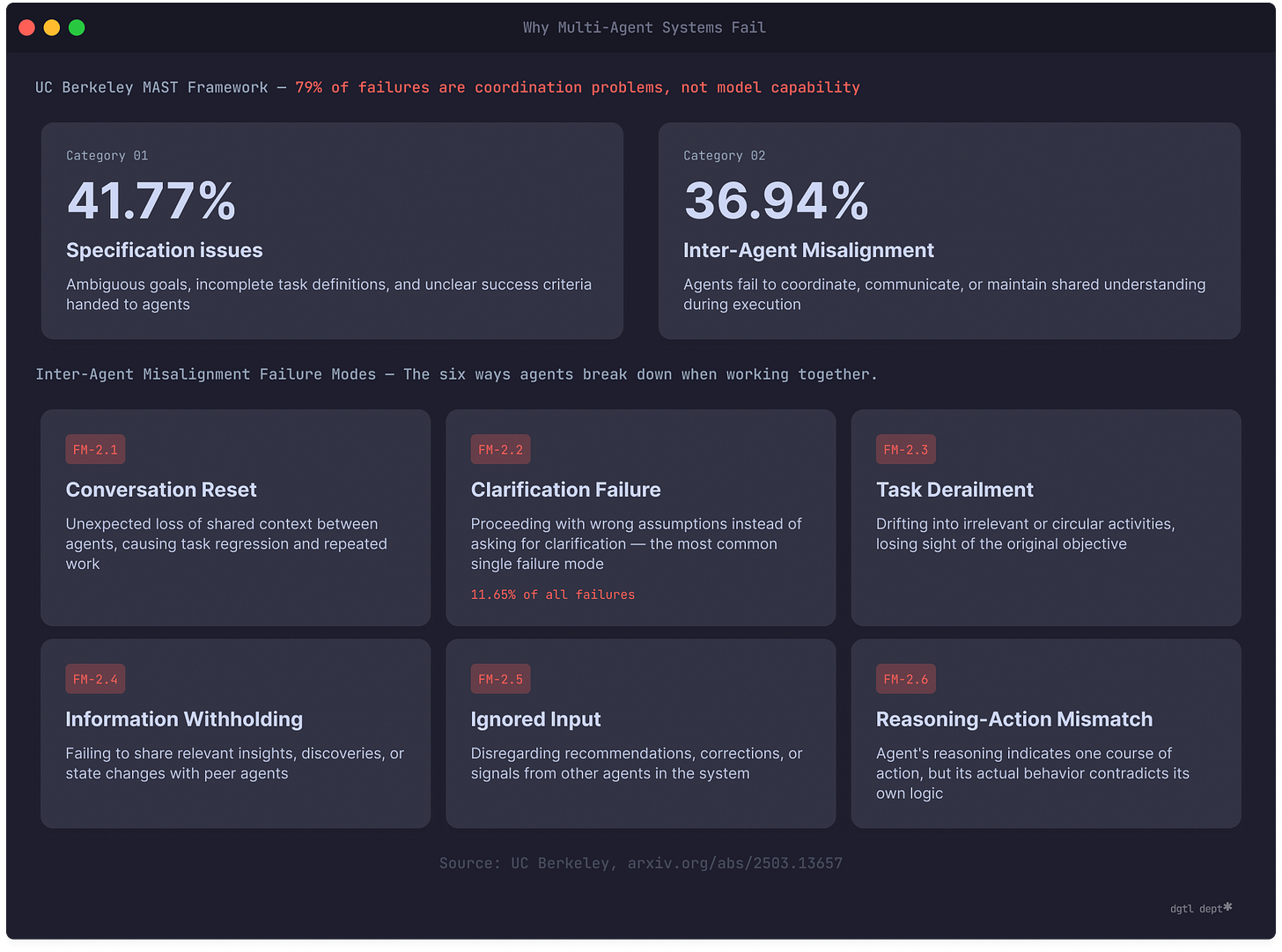 UC Berkeley published a paper last week analyzing 1,600+ failure traces across seven multi-agent frameworks. Their finding: 79% of failures were coordination and specification problems — not model capability, not infrastructure, not prompting.