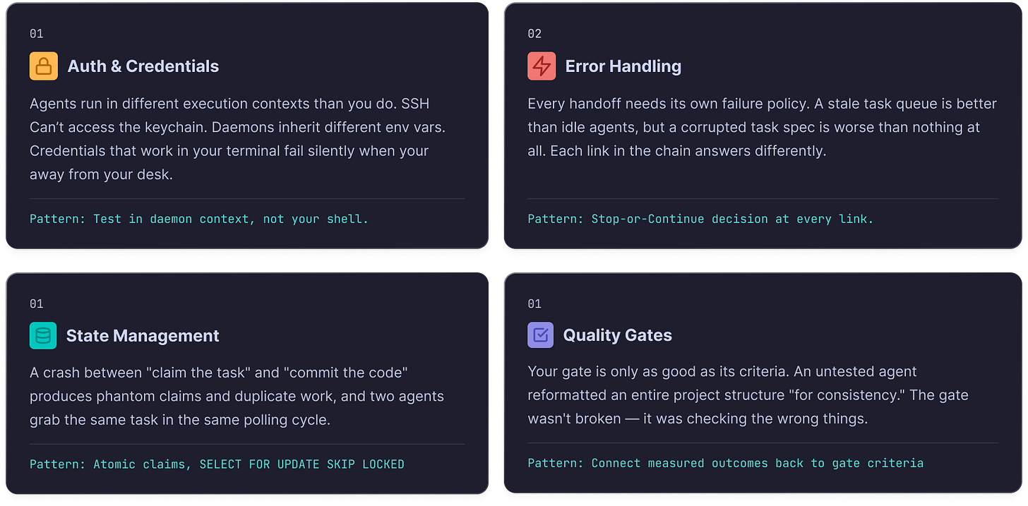 The pattern: State transitions should be atomic — claim the task and update the status in a single database transaction, so a crash produces a recoverable state rather than a phantom claim. This is solved-problem territory in software engineering — but the agent ecosystem hasn’t caught up yet. Most agent frameworks treat state as an afterthought, and honestly, most tutorials pretend it doesn’t exist.