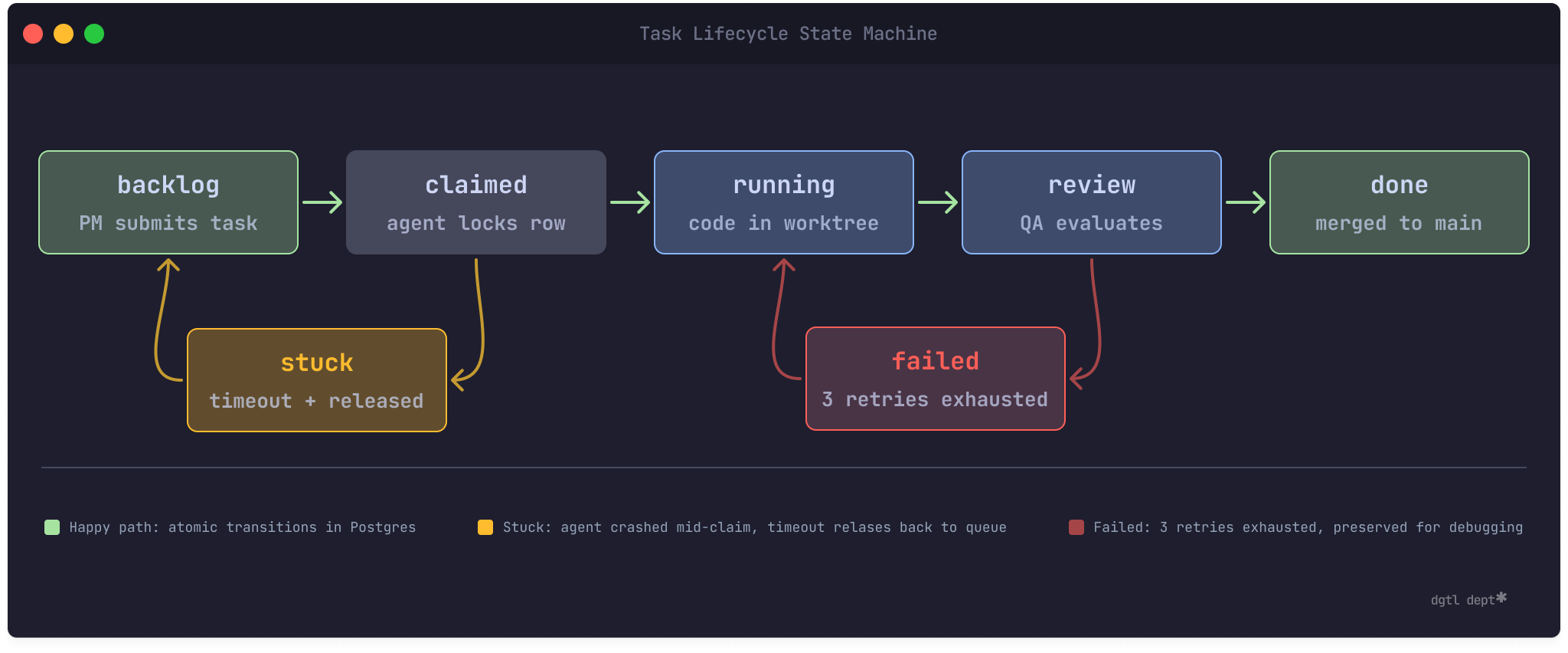 The fix: SELECT FOR UPDATE SKIP LOCKED. Agents claim tasks atomically at the database level — if another agent already has it, the query returns nothing instead of blocking. And stuck tasks get a timeout: if a task stays claimed for longer than its trust tier’s max turns would allow (more on that in a moment), the system releases it back to the queue.