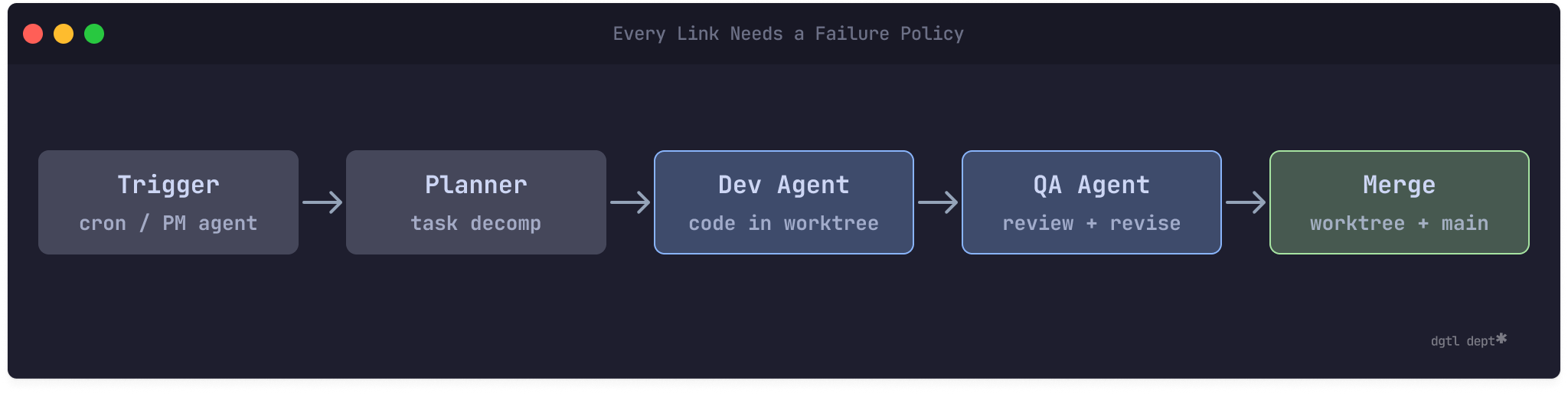 The problem: My orchestrator chains multiple agents together: a PM agent reads the roadmap and submits goals, a planner agent decomposes them into tasks, a dev agent writes the code, a QA agent reviews it. If the planner fails — bad input, parsing error, whatever — should the dev agent still pick up the last set of tasks?
