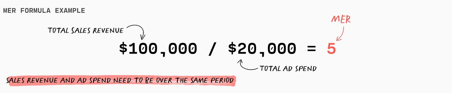 Marketing Efficiency Ratio; total revenue divided by total ad spend. No attribution windows, no platform self-reporting, no double-counted conversions. When Meta changes an attribution setting and your channel ROAS drops 30%, MER doesn’t move, because revenue didn’t move. It’s a bank-account balance, and that’s the point.
