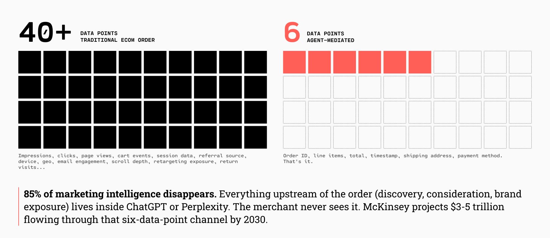 A traditional e-commerce order generates 40+ measurable touchpoints: impressions, clicks, page views, cart events, session duration, referral source. An AI-agent-mediated purchase generates six: order ID, line items, total, timestamp, shipping address, payment method. That’s an 85% reduction in marketing intelligence. McKinsey projects $3-5 trillion flowing through that six-data-point channel by 2030.
