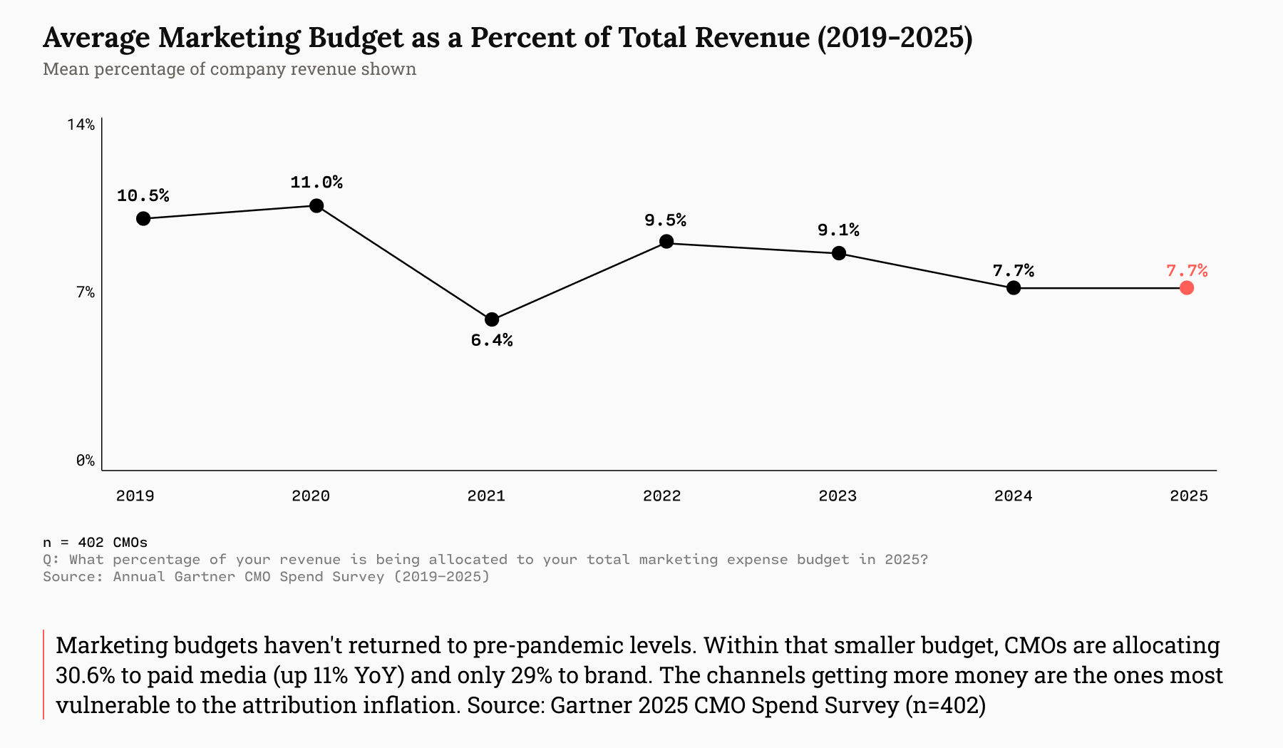 Airbnb cut $541M in performance marketing during 2020, then made it permanent. Revenue grew from $5.99B in 2021 to $12.2B by 2025 while holding marketing spend at 19% of revenue, with the majority in brand. Four years of brand investment built what a decade of performance spend hadn’t.