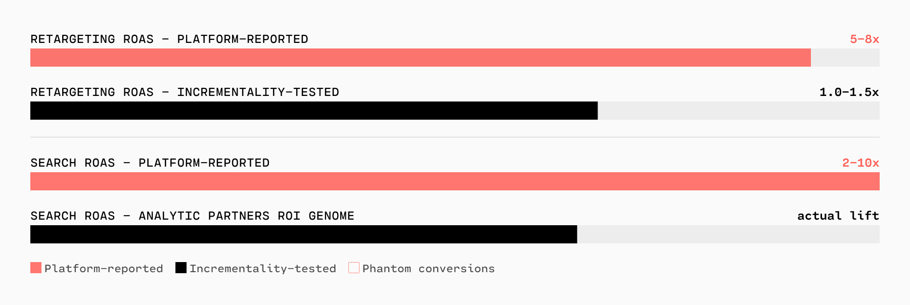 Meta’s retargeting numbers tell the same story at the campaign level. Platform-reported ROAS runs 5-8x. Run an incrementality test and the real number drops to 1.0-1.5x. Retargeting overwhelmingly captures users who were already going to buy. Fifty-four percent of advertisers are still running last-touch attribution models despite all of this.